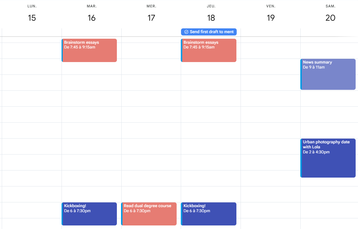 Tip: You can use Google calendar to organize your slots and centralize your tasks. It is a very effective way to keep track of deadlines and get an overview of the upcoming week.